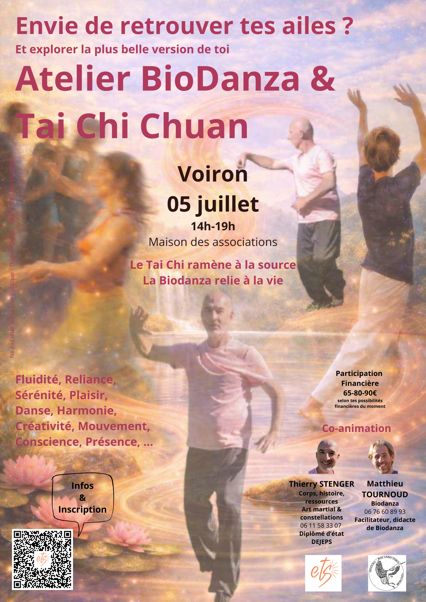 Chaque rencontre est une invitation à relier le corps, l’esprit et l’énergie subtile, à mettre en lumière ce qui nous limite pour le transformer en élan. Les pratiques proposées — qu’il s’agisse du Tai Chi Chuan, des constellations (familiales, ressources) ou un travail spécifique sur le corps — sont adaptées à tous les publics et visent à renforcer l’autonomie, le libre arbitre et la capacité à se déployer pleinement dans sa vie à ouvrir sa conscience et en faire son tremplin.