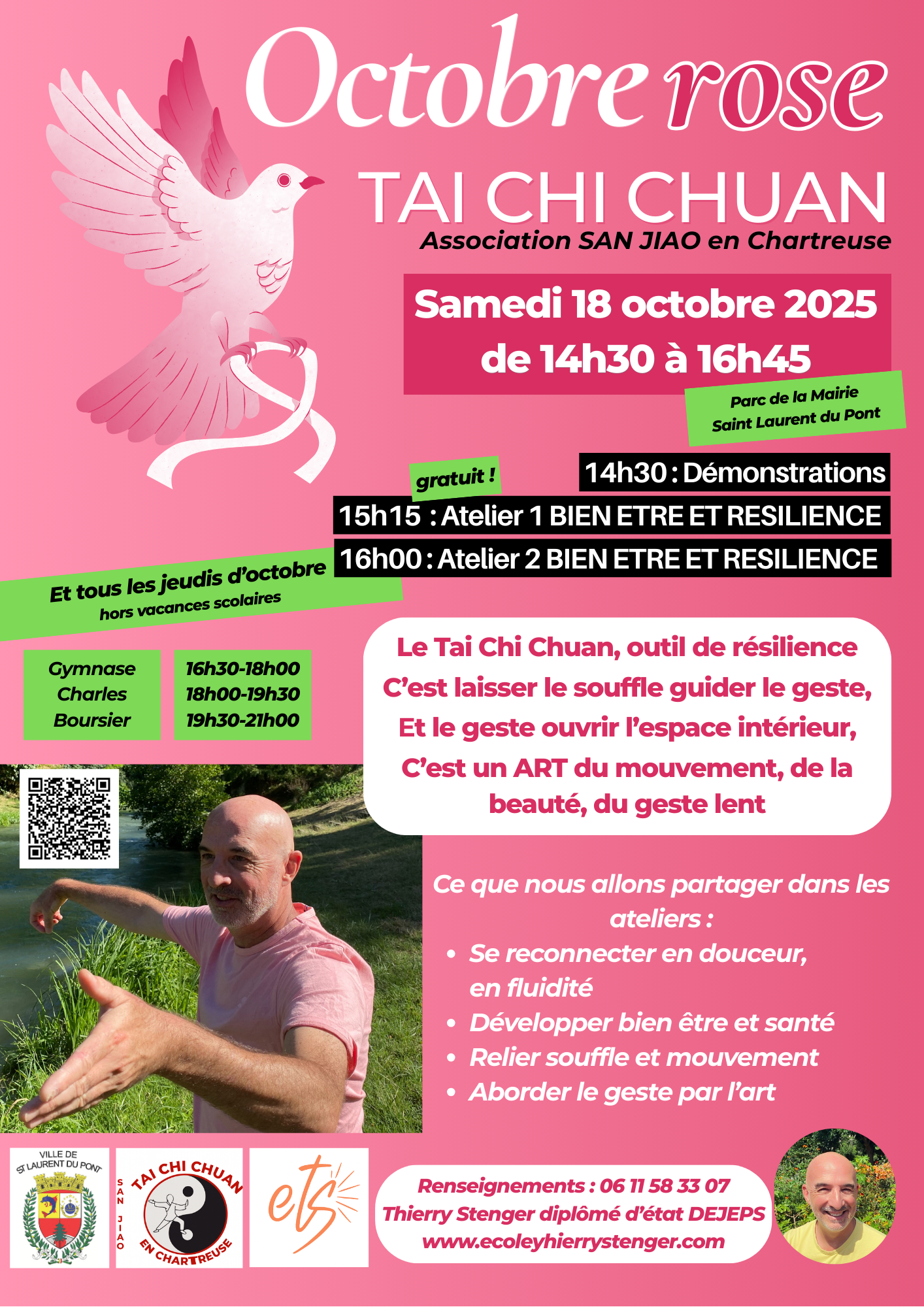 Avec l’association San Jiao en Chartreuse, nous proposerons, à partir de 14h30 une démonstration et deux ateliers de 45’ autour du bien-être et de la résilience, ouverts à toutes et tous. Le Tai Chi Chuan, c’est l’art de faire danser le souffle dans le corps, une méditation en mouvement qui apaise, renforce et relie.